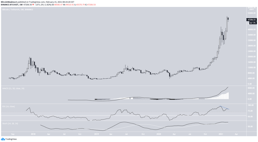 W tygodniu od 8 do 15 lutego cena BTC utworzyła byczą świecę na tygodniowym interwale, osiągając rekord wszech czasów na 49 707 USD w dniu 14 lutego.