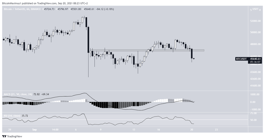 Na wykresie sześciogodzinnym widać, że Bitcoin spadł poniżej mniejszego obszaru wsparcia na 47 000 USD. Stało się to przez sporą niedźwiedzią świecę, więc jest to znak, że krótkoterminowy trend również zmienił się na spadkowy.
