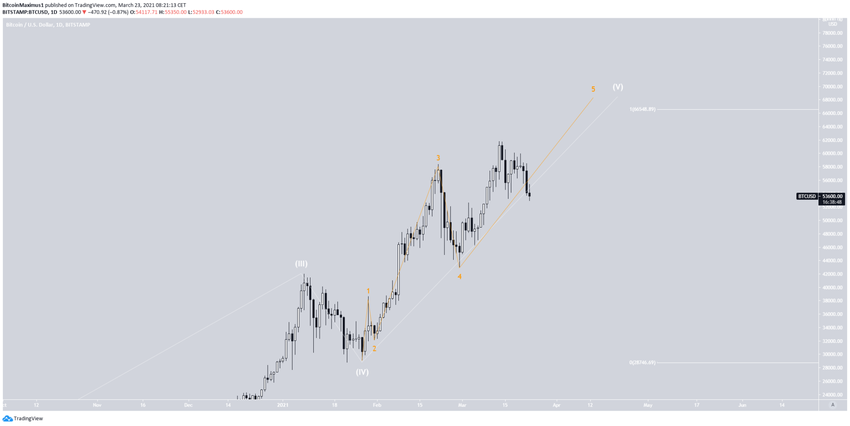 Główna liczba fal sugeruje, że BTC znajduje się w podfali podrzędnej czwartej (czarna). Ostateczny ruch w górę może zbliżyć się do przedziału 67 000 – 68 000 USD.