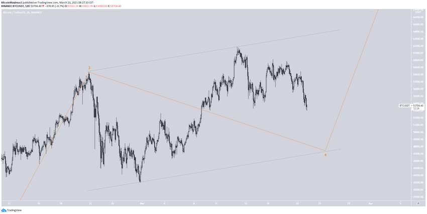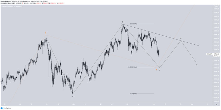 Możliwość trójkąta jest podobna, z wyjątkiem tego, że cena znalazłaby wsparcie w pobliżu 50 000 USD przed ewentualnym odbiciem.