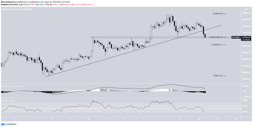 Wykres dwugodzinny pokazuje, że Bitcoin wybił się z rosnącej linii wsparcia.