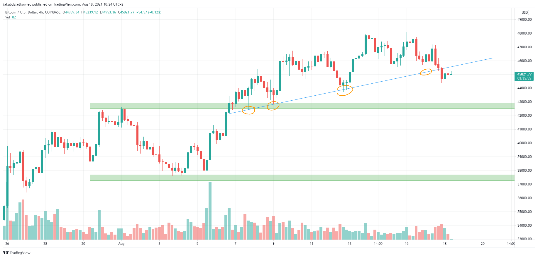 Po 4-krotnym przetestowaniu tego wsparcia (pomarańczowe okręgi), wczoraj wieczorem cena załamała się poniżej. Dzisiaj rano nastąpił niedźwiedzi retest tego obszaru i jego zamiana w opór.