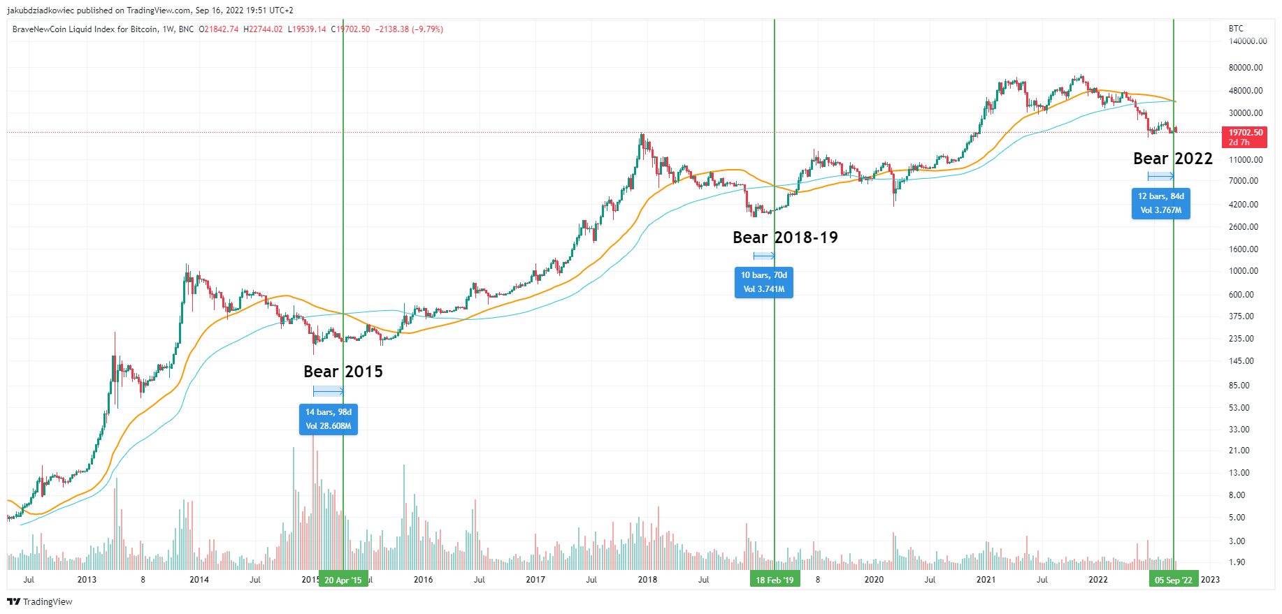Wcześniej sygnał ten pojawił się dwukrotnie: 20 kwietnia 2015 roku oraz 18 lutego 2019 roku. W obydwu przypadkach przecięcie miało miejsce kilkanaście tygodni bo tym, jak Bitcoin osiągnął absolutny dołek rynku niedźwiedzia. Podobnie jest i tym razem: