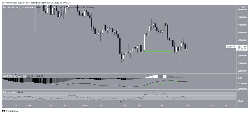 Na wykresie dziennym widać, że praktycznie cały ruch w górę miał miejsce w dniu 24 lutego. Wówczas Bitcoin utworzył byczą świecę młota (zielona ikona) z bardzo długim dolnym knotem.