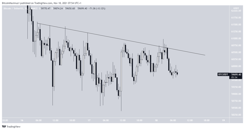 Bitcoin handluje wewnątrz wznoszącego się równoległego kanału od dnia 20 października. Ostatnio został odrzucony przez linię oporu tego kanału w dniu 10 listopada i rozpoczął ruch w dół. Doprowadziło to do dołka na poziomie 58 373 USD w dniu 17 listopada. Został on osiągnięty tuż przy horyzontalnym wsparciu na 59 700 USD.