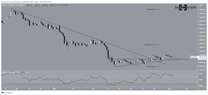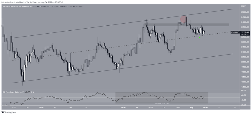 Bitcoin znajduje się powyżej wznoszącej się linii wsparcia od 18 czerwca. Linia ta była wielokrotnie potwierdzana, ostatnio w dniu 26 lipca. Doprowadziło to do lokalnego szczytu na poziomie 24 668 USD w dniu 30 lipca. Przez cały ten okres dzienny RSI, który wciąż znajduje się powyżej 50, również podążał za wznoszącą się linią wsparcia (kolor zielony).
