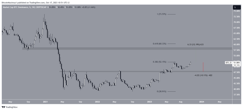 Po krótkim spadku, BTCD osiągnął wczoraj nowy roczny szczyt na poziomie 52,45%. Była to najwyższa wartość od ponad 900 dni, a dokładniej od kwietnia 2021 roku.