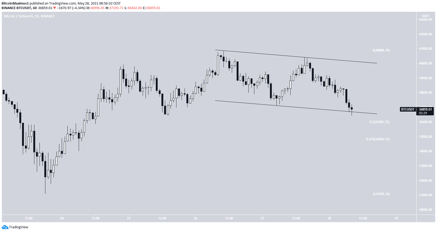 Cena znajduje się aktualnie na linii wsparcia tego kanału. Wcześniej osiągnęła poziomu wsparcia przy zniesieniu 0,5 Fib na poziomie 36 000 USD.
