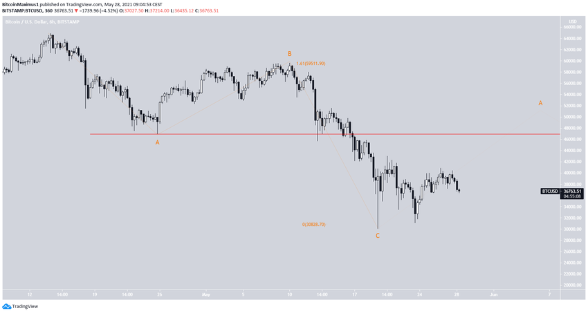 Zostałoby to potwierdzone przez wzrost powyżej dołka fali A na poziomie 47 004 USD (czerwona linia) i pasowałoby do długoterminowej liczby fal BTC.