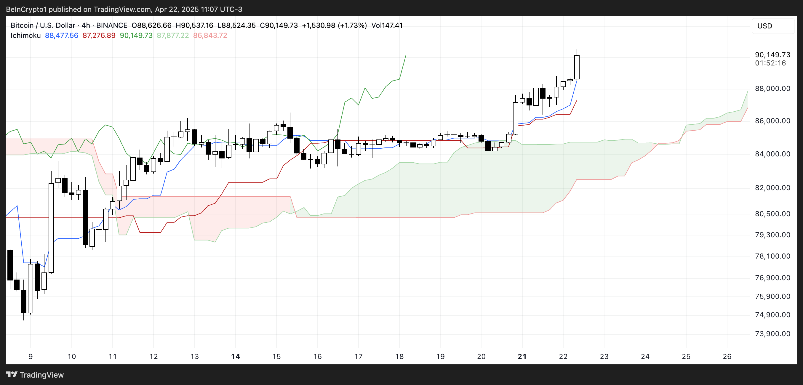 Bitcoin (BTC) wraca powyżej 90 000 USD po raz pierwszy od 5 marca. Wskaźniki momentum pokazują coraz bardziej bycze sygnały. Najnowszy wzrost towarzyszy gwałtownemu wzrostowi ADX, byczej formacji chmury Ichimoku i wyrównaniu linii EMA, które sprzyja dalszemu wzrostowi.