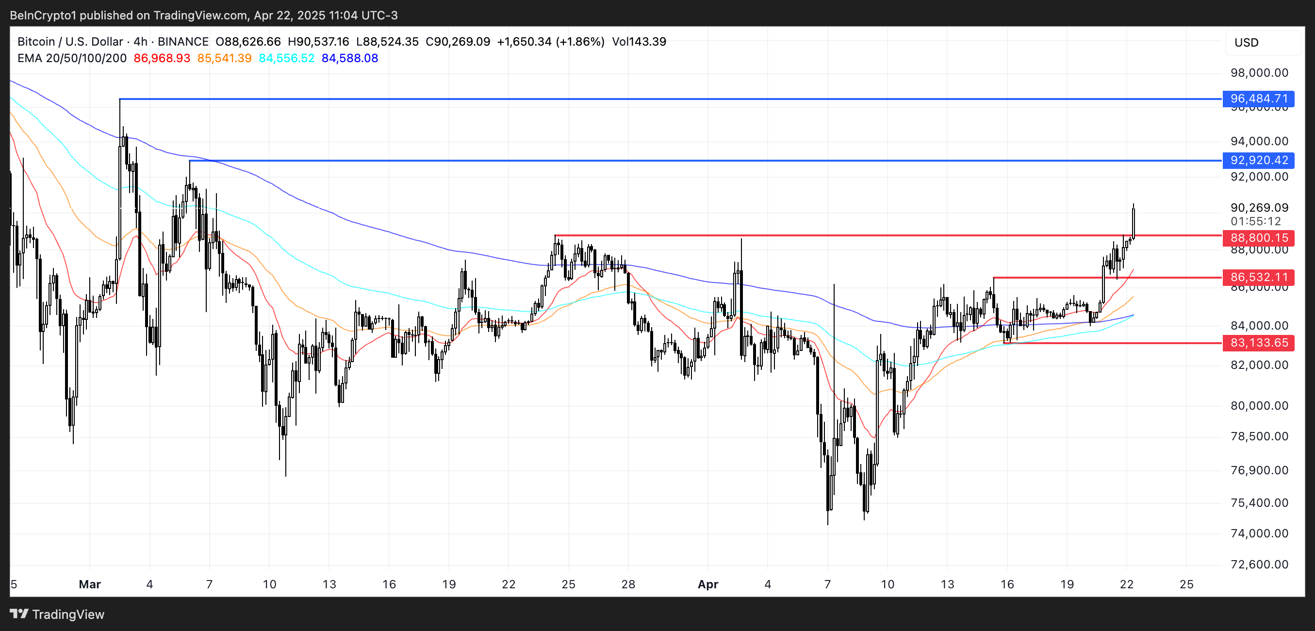 Jednak jeśli trend straci siłę i nastąpi odwrócenie, Bitcoin może doświadczyć krótkoterminowej korekty w kierunku wsparcia na poziomie 88 800 USD.