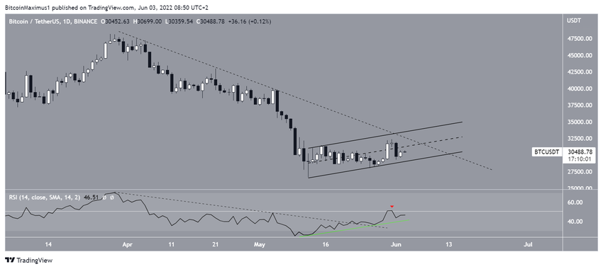 Od 12 maja Bitcoin rośnie wewnątrz wznoszącego się kanału równoległego. Ruch w górę doprowadził do osiągnięcia w dniu 31 maja szczytu na poziomie 32 399 USD. Początkowo wydawało się, że spowodowało to wybicie z horyzontalnego obszaru oporu na 31 800 USD. Jednak zaraz potem cena spadła, sprawiając, że wybicie okazało się jedynie odchyleniem (czerwony okrąg).