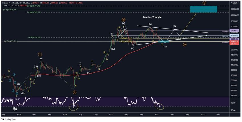 Kryptowalutowy trader @24kCrypto zamieścił wykres BTC, na którym cena kończy długoterminowy trójkąt fali czwartej. Wskazał również, że RSI dało byczy sygnał, który wcześniej pojawił się podczas dołka z marca 2020 roku.
