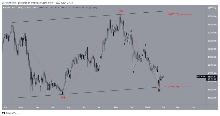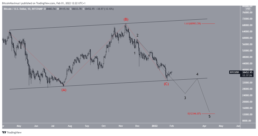 Liczba podfal jest podana na czarno, sugerując, że BTC znajduje się w podfali trzeciej. W tej możliwości, załamałby się z kanału, zatwierdzając go jako opór przed wznowieniem ruchu spadkowego.