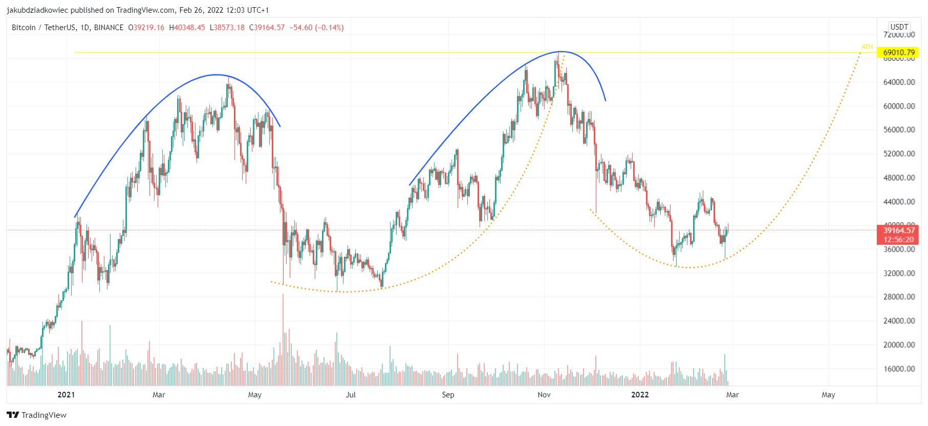 Patrząc na długoterminowy wykres BTC, który sięga początku 2021 roku, dostrzegamy analogiczną akcję cenową. Zarówno szczyty Bitcoina (niebieskie), jak i dołki (pomarańczowe, przerywane) nie były wyznaczane w wyniku jednorazowych wydarzeń.