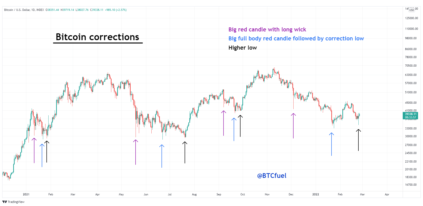 Miesiąc później, w dniu 24 lutego, Bitcoina osiągnął wyższy dołek na poziomie 34 322 USD i pozostawił po sobie dolny knot o wielkości 9%. Co więcej, odbicie zostało potwierdzone wzrostem wolumenu, który osiągnął najwyższy poziom od 7 września 2021 roku (niebieskie strzałki).