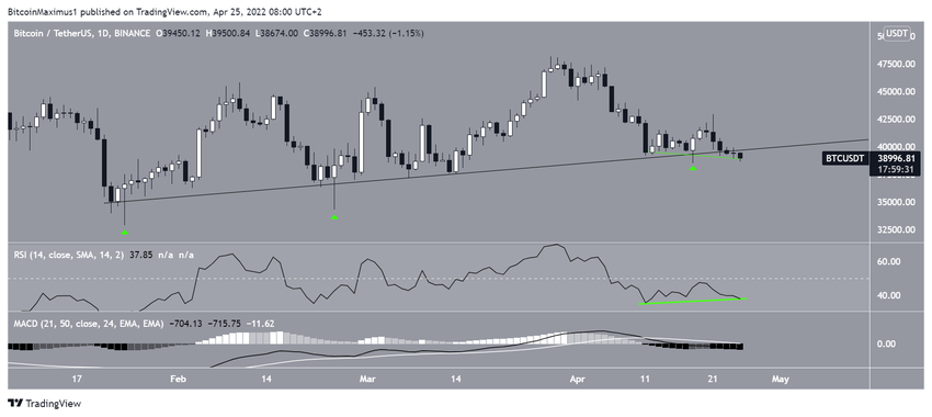 Pomimo tego, Bitcoin nadal handluje powyżej wznoszącej się linii wsparcia, która obowiązuje od maja 2021 roku. Linia ta znajduje się obecnie w pobliżu 38 000 USD.
