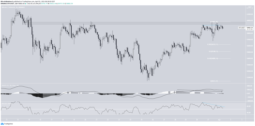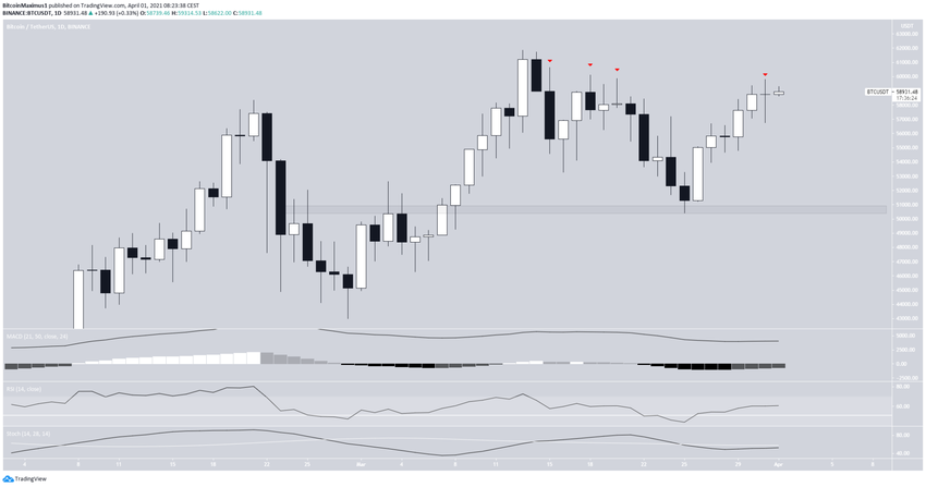 Podczas gdy BTC rośnie od dnia 25 marca, wczoraj trend utknął w martwym punkcie. Po osiągnięciu lokalnego szczytu na 59 800 USD w dniu 31 marca, BTC wygenerowało świecę doji – znak niezdecydowania. Może to być postrzegane jako oznaka słabości, gdy pojawia się w trendzie wzrostowym.