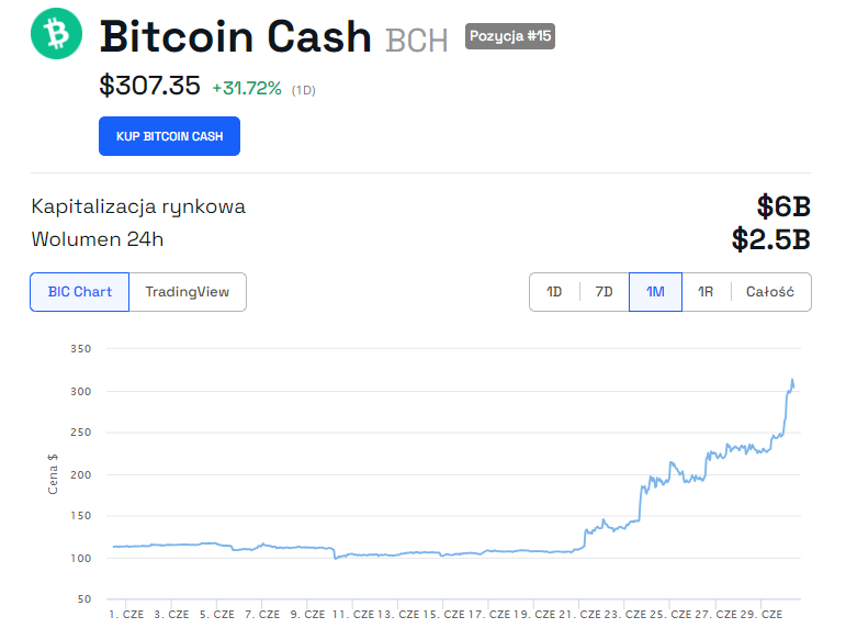 SponsoredCo więcej, BCH zyskał aż 186% w ciągu ostatnich dwóch tygodni. Pomimo ogromnej dynamiki na rynku, BCH pozostaje na poziomie 92% poniżej swojego historycznego szczytu z grudnia 2017 roku, który wynosił 3785 dolarów.