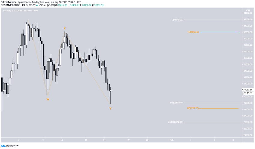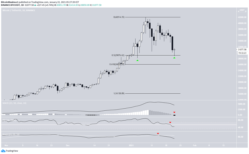 Podczas gdy spadek został wznowiony w dniu 22 stycznia, BTC odbiło się na poziomie zniesienia 0,5 Fib przy 29 000 USD i jest w trakcie tworzenia byczej świecy z długim knotem dolnym.
