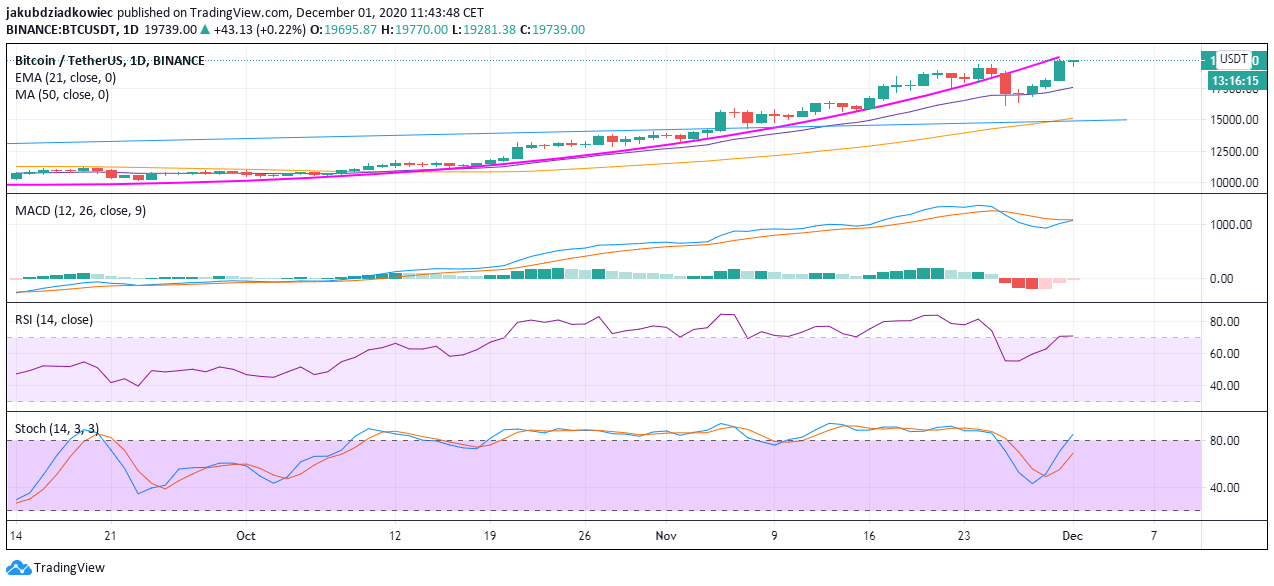 Aktualnie cena ponownie testuje obszar rekordu wszech czasów (ATH) w okolicach 19 800 USD, a wczorajsze knoty już nawet go zaczynają przekraczać. Bitcoin znajduje się wysoko ponad wszystkimi ważnymi średnimi kroczącymi, a dzienne wskaźniki techniczna dają bycze odczyty.