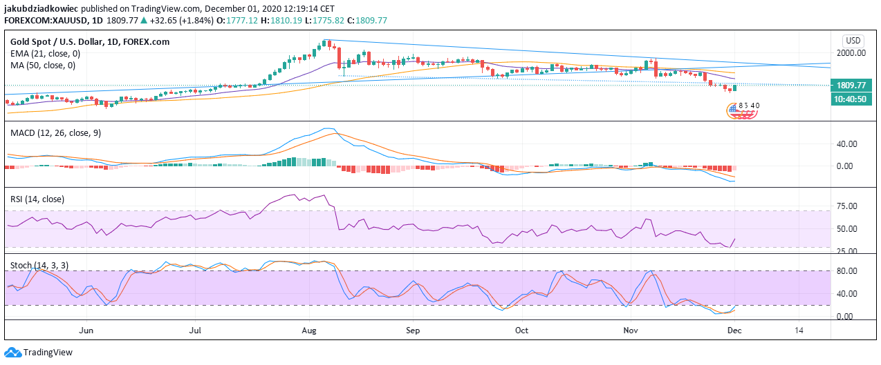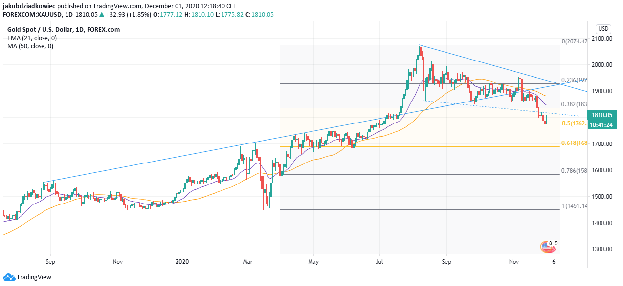 Aktualnie złoto odbija się od ważnego poziomu wsparcia w obszarze 0,5 Fib całego poprzedniego ruchu wzrostowego i osiągnęło lokalny dołek na 1765 USD. Cena już wcześniej utraciła ważne średnie kroczące, 21 EMA oraz 50 MA, a także dwie diagonalne linie wsparcia. W momencie pisania tego tekstu cena złota wynosiła 1810 USD.