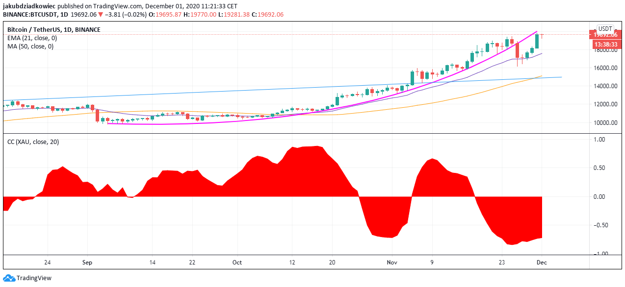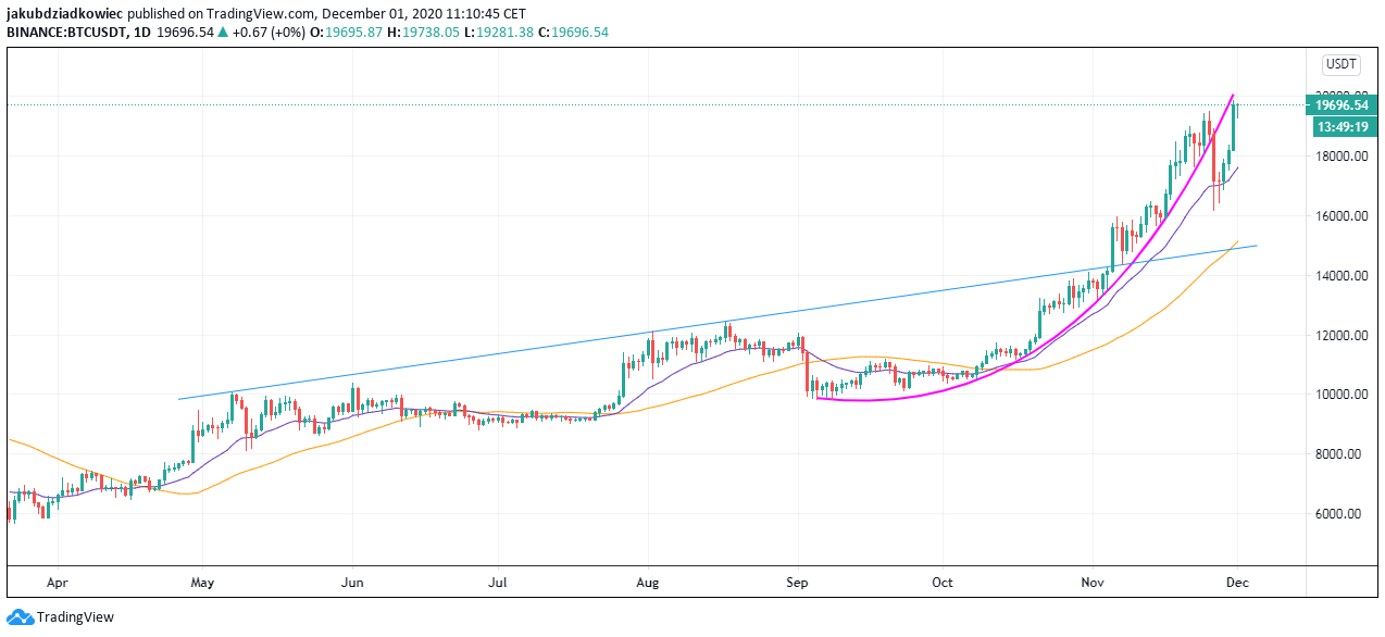 Na przestrzeni ostatnich dwóch miesięcy cena Bitcoina doświadczyła parabolicznego wzrostu, nieomal podwajając swoją wartość. W dniu 25 listopada nastąpiła długo oczekiwana korekta, która jednak nie trwała długo.