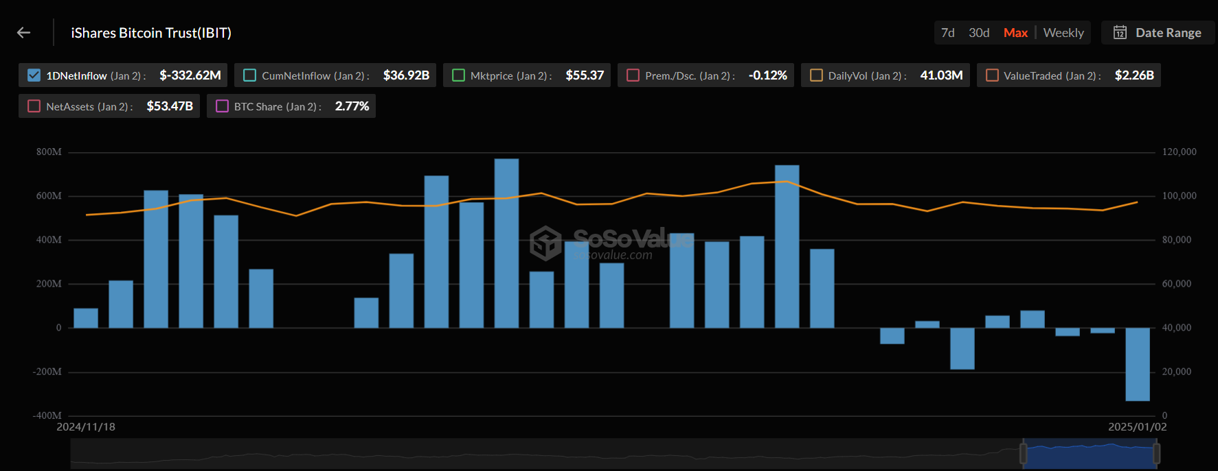 Zgodnie z danymi od SoSoValue, fundusz IBIT odnotował rekordowy odpływ 330,8 mln USD w dniu 2 stycznia, co odpowiada ponad 3500 BTC. Po rekordowym odpływie IBIT, całkowite dzienne odpływy netto wszystkich ETF-ów BTC wyniosły 242 mln USD.