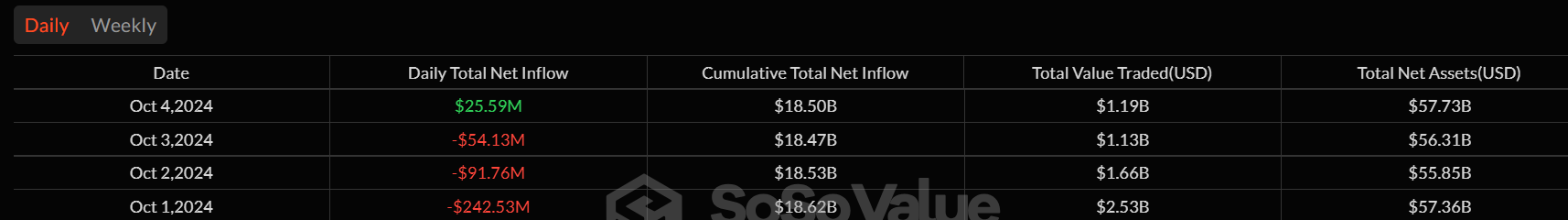 W świetle ostatnich wydarzeń politycznych i gospodarczych, 4 października amerykańskie fundusze ETF na Bitcoinie odnotowały pierwszy przypływ środków w miesiącu. W rezultacie BTC odbiło się od ostatnio notowanych odpływów wynoszących 400 mln USD w pierwszych trzech dniach handlu.