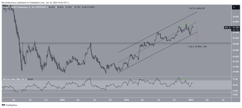 Wykres 3-dniowy dla BTCD pokazuje, że cena wzrosła wewnątrz rosnącego kanału równoległego od listopada 2022 roku. Takie kanały zwykle zawierają ruchy korekcyjne, co oznacza, że prawdopodobne jest ich przełamanie.