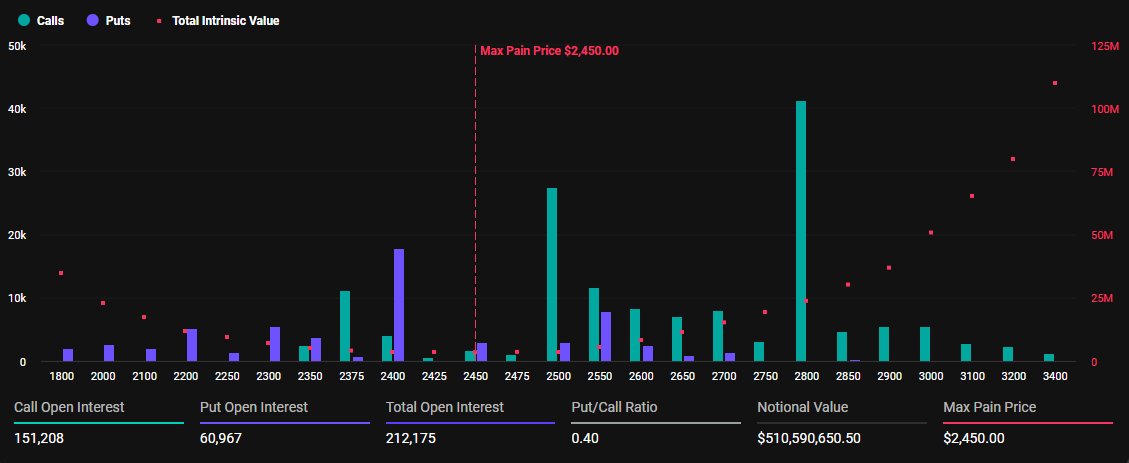 Jeśli chodzi o Ethereum, w dniu dzisiejszym wygaśnie 212 175 kontraktów. Stosunek sprzedaży do kupna wynosi 0,40 a maksymalny punkt bólu wynosi 2 450 USD.