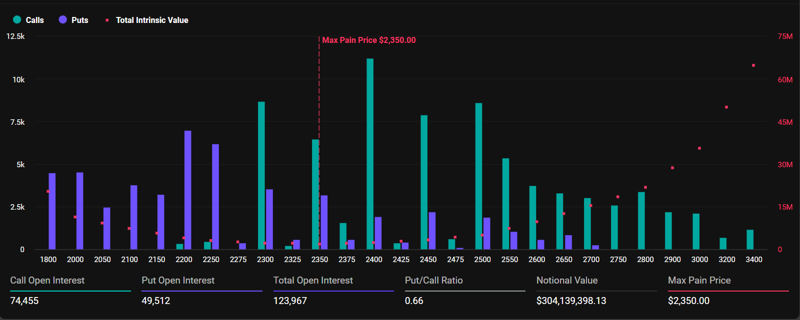 Podobnie, rynek opcji na Ethereum wygaśnie z 125 046 kontraktami o wartości 308,16 mln USD. Dzisiejsze wygasające kontrakty na Ethereum mają stosunek put do call wynoszący 0,65, z maksymalnym punktem oporu 2 350 USD.