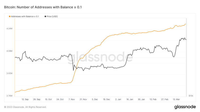 W międzyczasie inwestorzy coraz częściej dywersyfikują swoje portfele i stawiają na alternatywne rozwiązania, takie jak Bitcoin. Utworzono ponad 4,28 mln portfeli Bitcoin, w których znajduje się co najmniej 0,1 BTC.