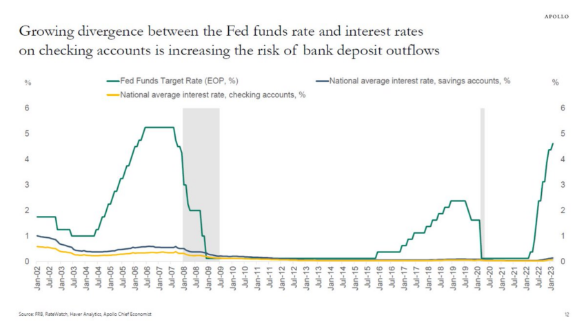 Sponsored SponsoredTorsten Slok, partner i główny ekonomista Apollo, twierdzi, że różnica między stopą Fed Funds a oprocentowaniem rachunków czekowych “jest podstawowym powodem, dla którego pieniądze są wyprowadzane z depozytów bankowych”. Slok uważa, że ta rosnąca rozbieżność jest “w najwyższym stopniu nietypowa w porównaniu z poprzednimi kryzysami bankowymi, w których źródłem niestabilności były zazwyczaj straty kredytowe”.