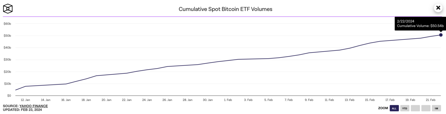 Należy zauważyć, że fundusze ETF oparte na Bitcoinie nadal zaskakują inwestorów swoją popularnością i przyciągają nowy kapitał. W ciągu zaledwie 24 godzin całkowity wolumen obrotu takimi funduszami przekroczył poziom 50 miliardów dolarów. Osiągnięcie tego poziomu zajęło instrumentom dokładnie sześć tygodni.