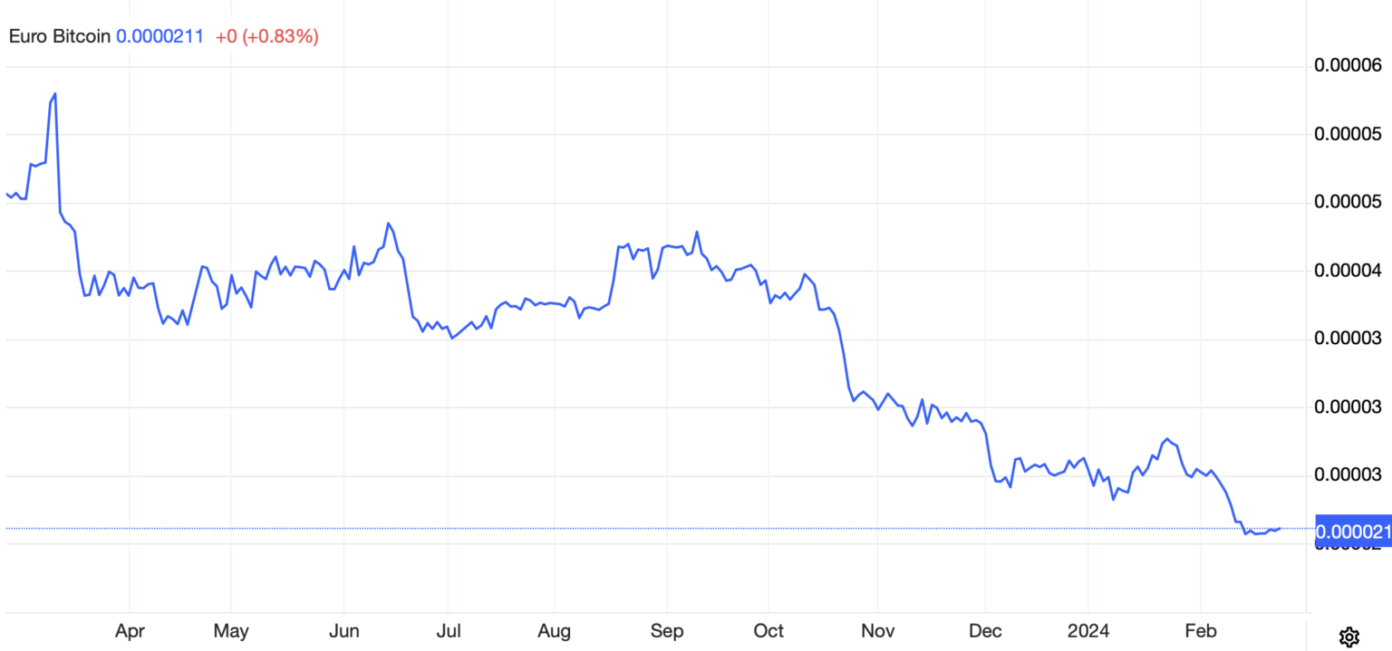Link do wpisu został opublikowany z oficjalnego konta EBC na Twitterze. Entuzjaści kryptowalut wykorzystali ten fakt, aby dodać kontekst do postu i podzielili się ważnymi informacjami, które sugerują, że wnioski bankierów są błędne. Jeden z nich opublikował wykres utraty siły nabywczej euro.’