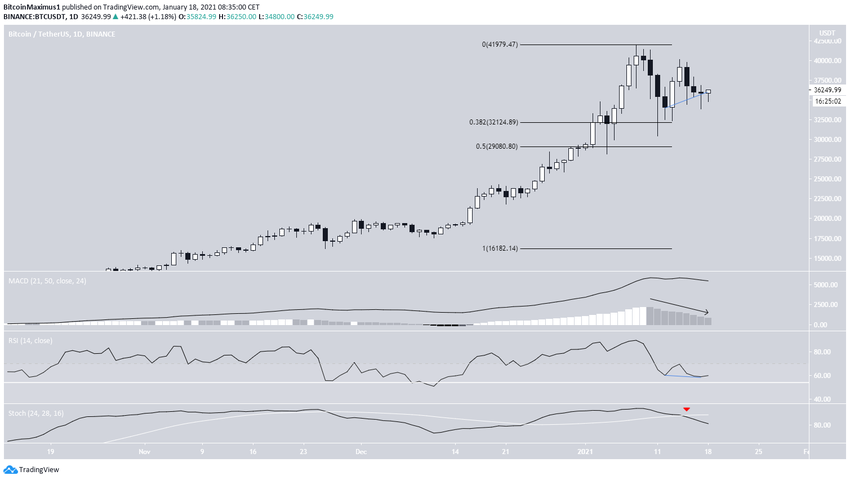 Wykres dzienny wygląda bardziej niedźwiedzio niż jego tygodniowy odpowiednik. Podczas gdy BTC odbił się od wsparcia na poziomie zniesienia 0,382 Fib o wartości 32 125 USD i wygenerował ukrytą byczą dywergencję na RSI, pozostałe odczyty są niedźwiedzie.