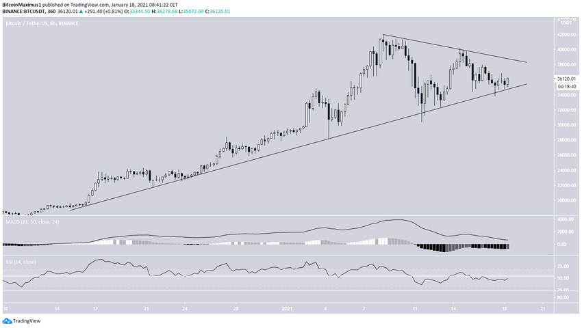 Sześciogodzinny wykres pokazuje, że BTC podążał za rosnącą linią wsparcia od dnia 14 grudnia i prawdopodobnie znajduje się wewnątrz symetrycznego trójkąta. Ten wzór jest zwykle uważany za neutralny.