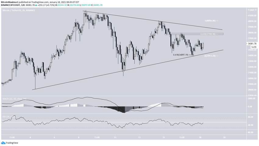 Oczekuje się, że BTC napotka opór na 37 700 USD. Poziom ten jest połączeniem poziomu zniesienia 0,618 Fib, horyzontalnego obszaru oporu i prawdopodobnie opadającej linii oporu trójkąta.