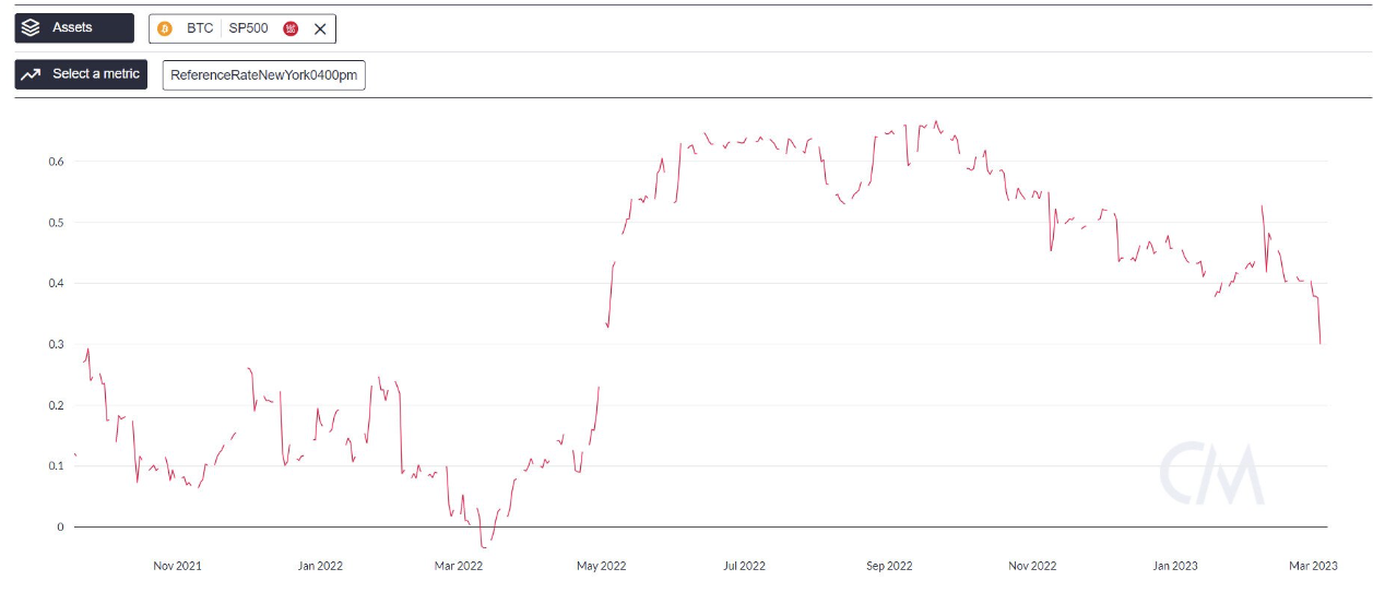 Według wykresu z CoinMetrics, 60-dniowa korelacja pomiędzy ceną Bitcoina a ceną zamknięcia S&P 500, największego śledzonego amerykańskiego indeksu giełdowego, spadła do najniższego poziomu od kwietnia 2022 roku. Na początku tego tygodnia znalazła się na poziomie 0,30.