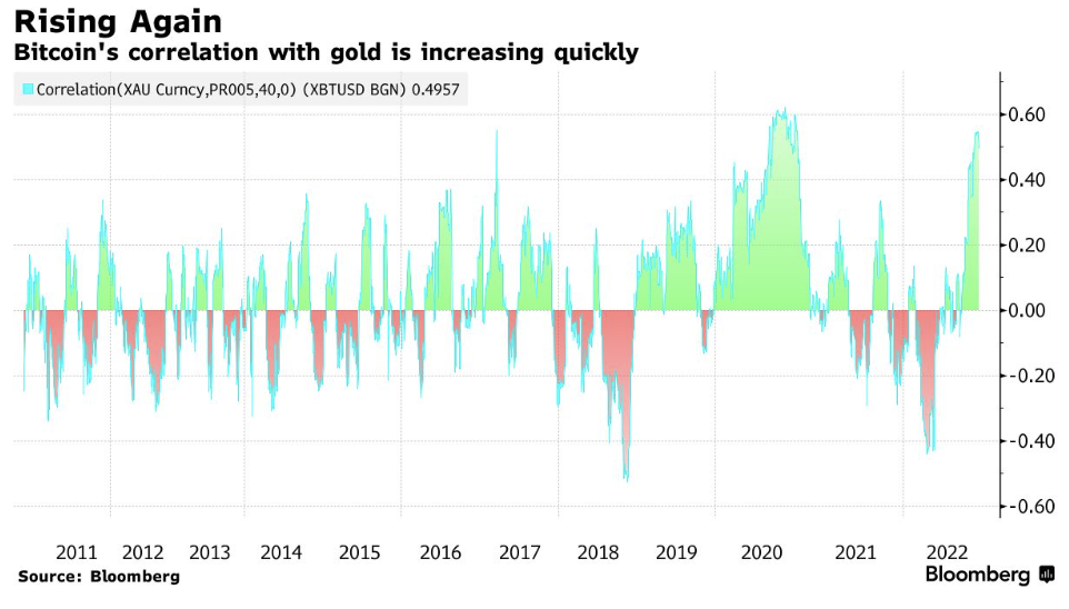 Pomimo tego, że amerykańskie akcje mają wyższą korelację ze złotem, Bitcoin również ją posiada. Pierwotna kryptowaluta przeszła od wyniku zerowego do 40-dniowej korelacji ze złotem na poziomie około 0,50 – podsumowują stratedzy w rozmowie z Bloombergiem. Jest to niemal najwyższa korelacja, jaką Bitcoin miał kiedykolwiek.
