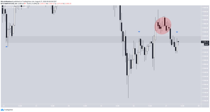 Wykres godzinowy pokazuje, że cena początkowo wybiła się z obszaru 11 400 USD, który wcześniej działał jako opór. Jednak ponownie znalazła się w tym zakresie i jest obecnie w trakcie potwierdzania go jako oporu.