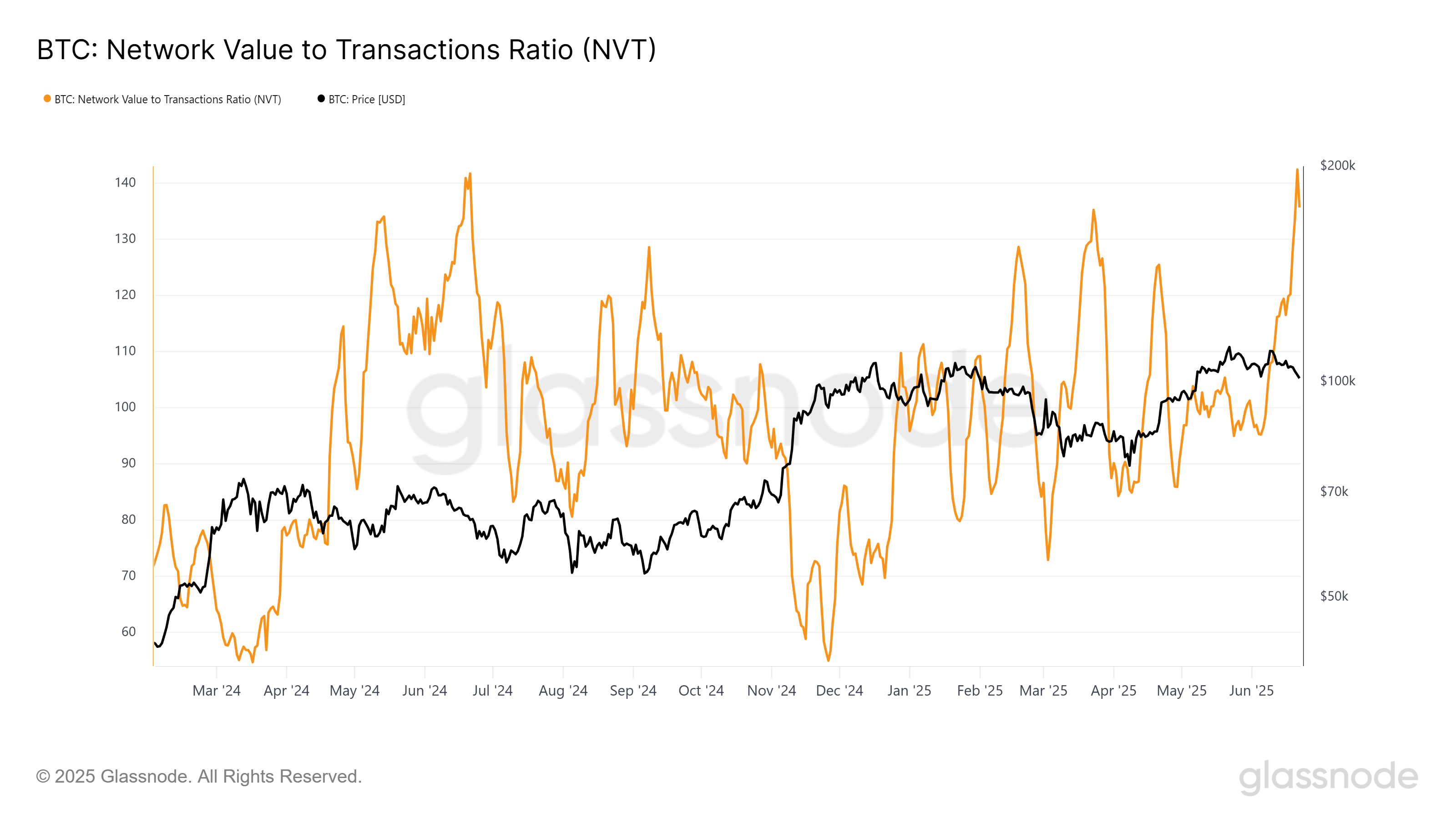 Wskaźnik wartości sieci do transakcji (NVT) dla Bitcoina jest obecnie na najwyższym poziomie od roku. Sygnalizuje to, że wycena sieci znacznie przewyższa aktywność transakcyjną. Historycznie taki skok wskaźnika NVT często poprzedzał korektę rynku.