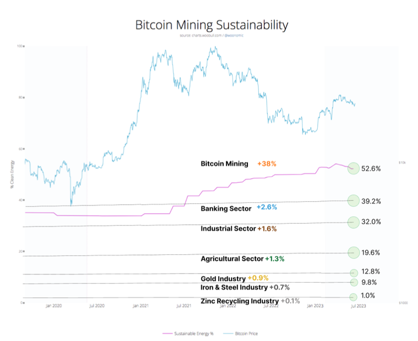 Według analizy Daniela Battena, Bitcoin korzysta z aż 52,6% zrównoważonej energii. Wynik ten plasuje go na czele światowych użytkowników tego rodzaju źródeł energii. To oznacza, że kryptowaluty, zwłaszcza te oparte na Proof-of-Work (PoW), wykorzystują bardziej zrównoważoną energię niż inne branże. Zgodnie z jego analizą, proces wydobywania kryptowaluty Proof-of-Work (PoW) pochłania większą ilość zrównoważonej energii w porównaniu do sektora bankowego (39,2%), sektora przemysłowego (32%), sektora rolniczego (19,6%), przemysłu złota (12,8%) oraz hutnictwa żelaza i stali (9,8%).