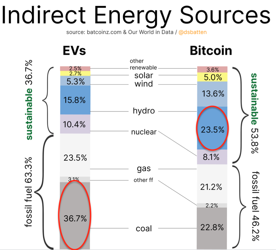 Porównanie między Bitcoinem a pojazdami elektrycznymi rzuca nowe światło na kwestię zrównoważonego rozwoju. Daniel Batten zwraca uwagę, że pojazdy elektryczne zużywają 36,7% zrównoważonej energii. W przypadku Bitcoina, wartość ta sięga aż 53,8%. Jednakże, gdy spojrzymy na zużycie paliw kopalnych, sytuacja ulega odwróceniu – pojazdy elektryczne wykorzystują 63,3%, podczas gdy Bitcoin jedynie 46,2%.