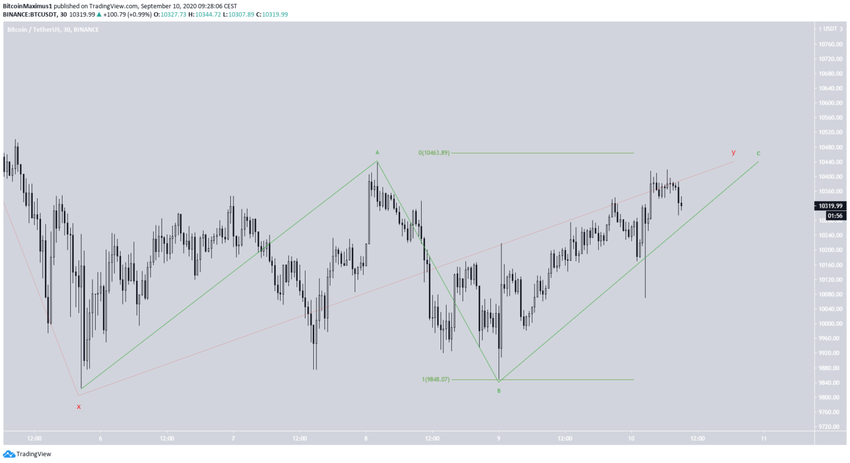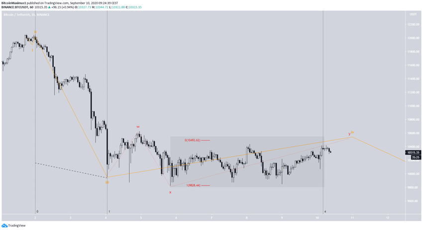 Ze względu na czas trwania fali 4 w stosunku do poprzedniej fali 3, prawdopodobne jest, że cena koryguje się w złożonej strukturze W-X-Y (na czerwono). Docelowy koniec tej fali wyniósłby blisko 10 490 USD, biorąc pod uwagę długość fali X.