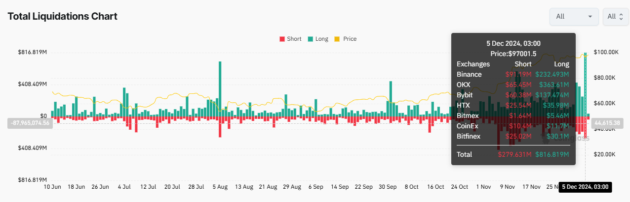 Dane od Coinglass ujawniają, że niemal 900 mln USD w pozycjach na BTC zostało zlikwidowanych. Stało się to, gdy jego cena gwałtownie spadła z 100 000 USD do 90 000 USD, zanim odbiła się do 97 000 USD.