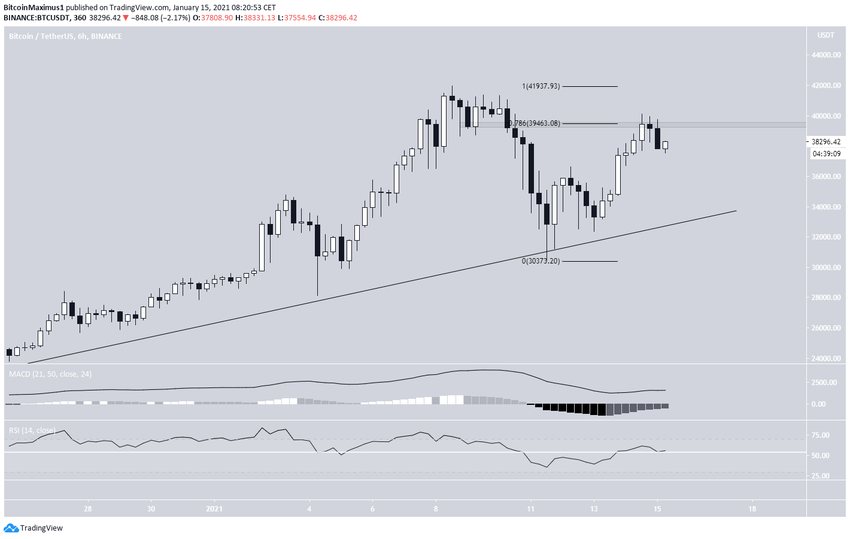 Sześciogodzinny wykres pokazuje, że BTC zostało odrzucone na poziomie zniesienia 0,786 Fib, który wcześniej działał jako wsparcie. W związku z tym obszar 39 463 USD został potwierdzony jako opór.