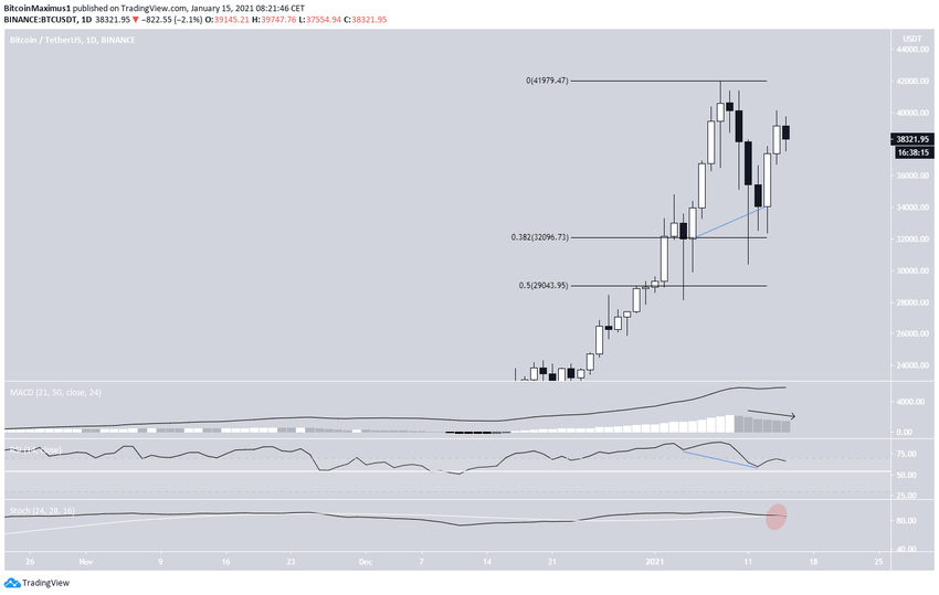 BTC poruszał się w górę od czasu osiągnięcia lokalnego dołka na poziomie 30 402 USD w dniu 11 stycznia. Stworzył długi knot dolny tuż powyżej poziomu zniesienia 0,382 Fib ostatniego ruchu w górę.