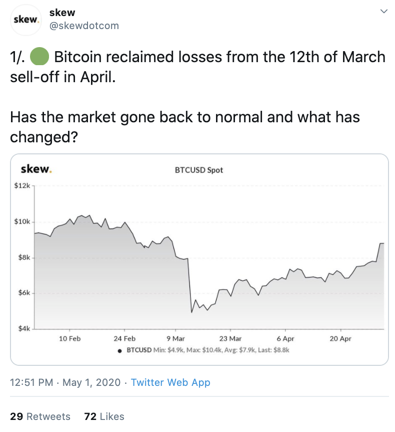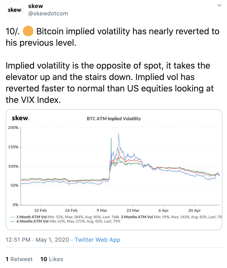 Zmienność Bitcoina również spadła po wyjątkowo niestabilnym marcu, jak wcześniej informował BeInCrypto. Na obecnym etapie domniemana zmienność Bitcoina wróciła do „normalnych” poziomów, jak wskazuje @skewdotcom.